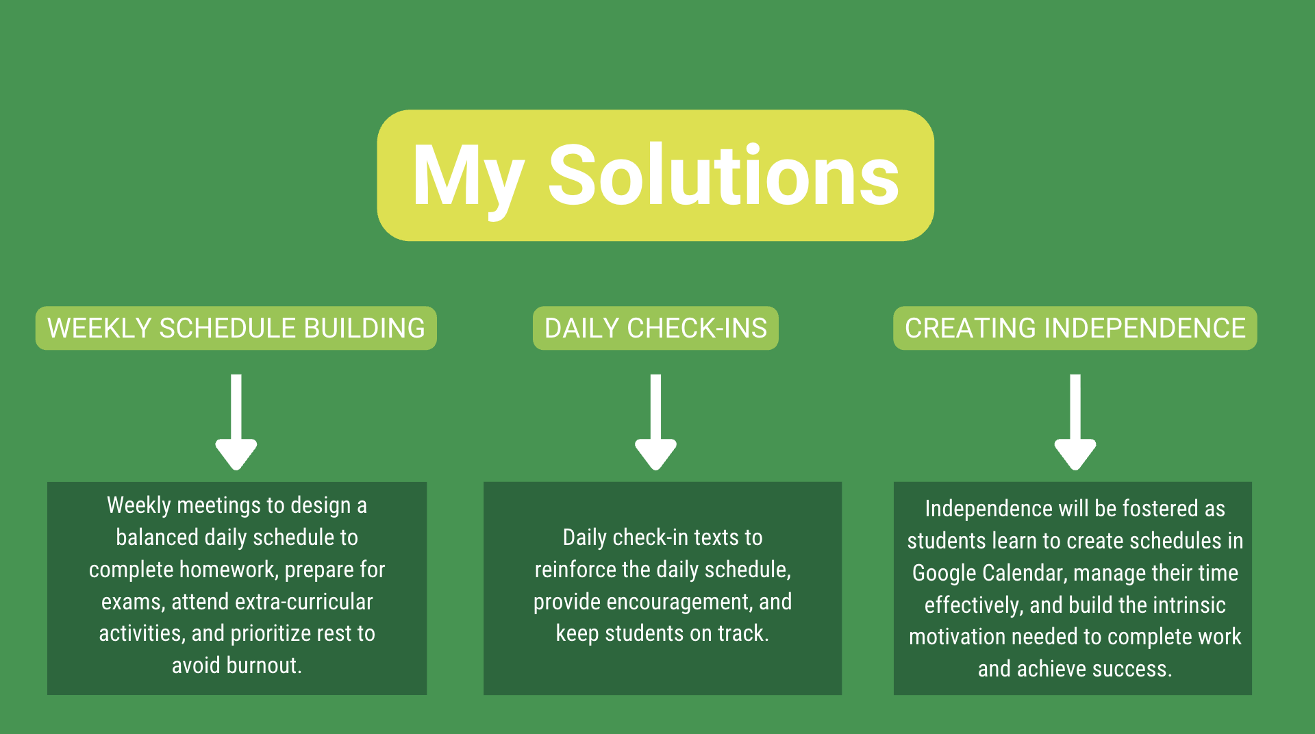 Independence will be fostered as students learn to create schedules in Google Calendar, manage their time effectively, and build the intrinsic motivation needed to complete work and achieve success.